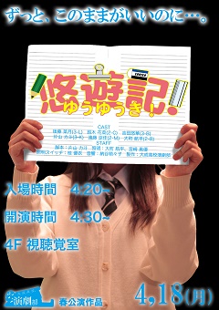演劇部は4月18日(月)に、春公演「悠遊記!」を行います。 16:20開場 16:30開演となります。 在校生のみなさん、是非とも観に来てください。注)本公演は校内公演となります。観賞ご希望の保護者の皆様は、ネームプレートをご用意の上、当日受付にてご提示下さい。OB/OGのみなさんは、顧問へ連絡をお願いします。