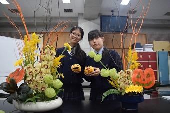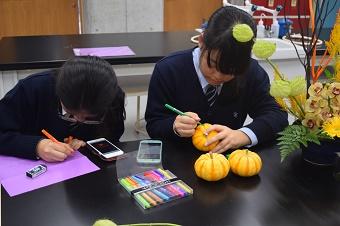 10月も残りは数えるほど…イベントごとは全力で楽しみたい「華道部」。その華道部が、このイベントを見逃すはずがありませんよね。 さてさて、作品はホラーテイストにしようか… それとも、ハッピーテイストにしようか… そうそう、例のカボチャも作らなければ!校舎に飾るので、華道部からのメッセージも置きましょう。 ハッピーハロウィーン!!同じ花材でも、雰囲気がかなり違うのが、面白い!!校舎のどこかに、カボチャが3つ。是非見つけください!!