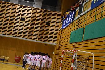 先手を取ったのは明星。本校選手のミスを見逃さず、次々と速攻を繰り出す中、本校は防戦に回ります。1-6と5点差が離れたところで、たまらずタイムアウト。しかし、明星の流れを断ち切ることができません。前半は防戦一方に回り、12-27で折り返します。15点差...。厳しい点差がつけられてもなお、本校ハンドボール部は諦めません。